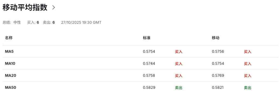 技术指标显示,日图级别上,布林带上轨当前收缩至0.5840附近区域,与50日均线形成粘合,二者共同构成纽币短期关键动态阻力。布林带中轨则维持于0.5760附近区域区域,为纽币短期价格走势提供多空力量以及强弱格局核心分化枢纽。而布林带下轨维持0.5680一线,为纽币当前价格走势提供动态支撑。布林带开口呈现收敛迹象,表明市场短期波动率将有所下降,汇价或偏向进入阶段性震荡整理格局。需要注意的是,纽币当前价格走势正位于布林带中轨附近区域发起试探,伴随14日RSI相对强弱指标未能回升至55-45强弱平衡区,反映尽管当前多头动能呈现逐步修复迹象,但仍然缺乏充足上行驱动力,空头动能仍占据主导优势。然而,积极信号显示,RSI指数较前期低值有所回升,提示多头动能正在呈现缓慢修复迹象,短线技术性反弹条件以及“超卖—均值回归”需求正在累积,如若纽币可有效突破布林带中轨区域,伴随RSI指数回归55-45强弱平衡区,则将提示多头动能复苏动力上升,为汇价短期进一步回升提供潜在技术空间。与此同时,MACD显示DIFF-0.0028、DEA -0.0037、MACD柱状图维持负值区间放大,双线位于零轴下方但较此前有所缩量,显示空头量能收缩但并未能形成明显趋势性反转信号,若后续柱状图维持负值缩窄并出现零轴上方的回测,将有望触发真实技术性以及趋势性反弹的概率。