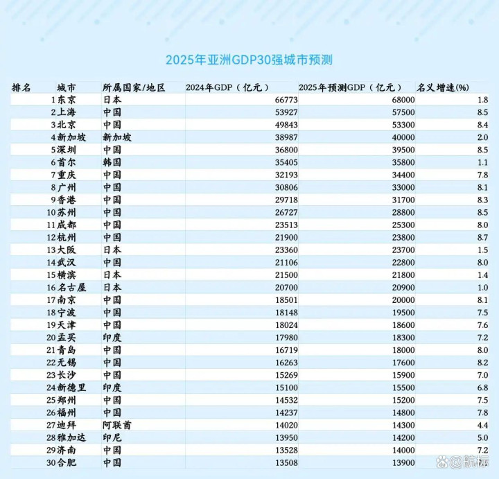就在 2025 年亚洲 GDP30 强预测名单新鲜出炉,17 座中国城市的集体亮相,不仅让 “中国城市集群” 成为亚洲经济最亮眼的注脚,更暗藏着国家战略赋能与城市产业突围的深层逻辑。从东京、上海的头部对垒,到合肥、济南的新晋突围,这份榜单里的数字跳动,既是经济实力的具象化,也是政策红利、产业链升级与区域竞合的鲜活样本。