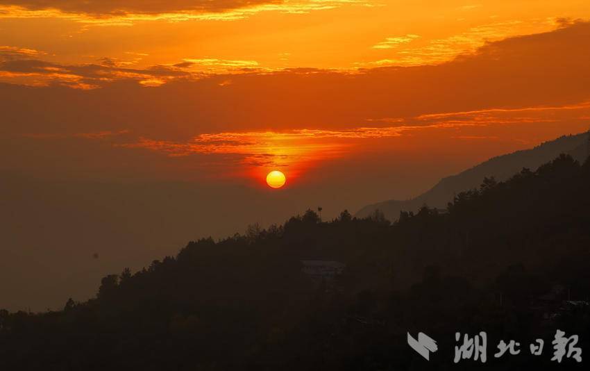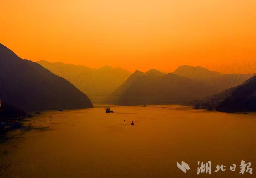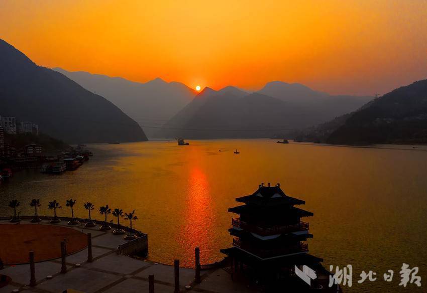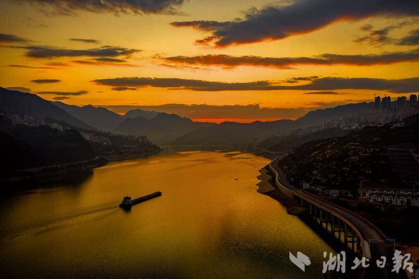 湖北日报客户端(通讯员陈功龙)暮云合璧,落日熔金。当余晖掠过巫峡群峰,巴东的江面便晕染成一片橘红。远山叠作墨色剪影,江船拖着粼粼波光缓缓驶过,与天际落日相映,峡江的雄浑与柔美在此刻交融。日轮渐隐,天空由橙黄转为绯红,流云镶上金边,江畔楼阁凝为静默轮廓,如画卷中点睛之笔。