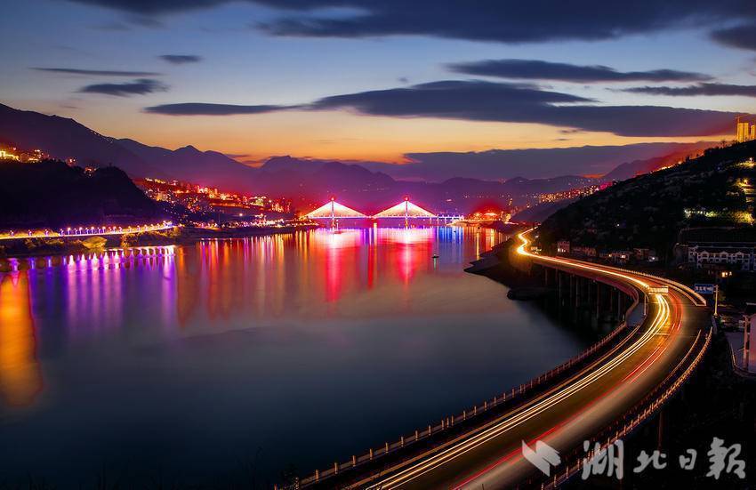 霞光散尽,夜色初临。沿岸灯火次第点亮,彩虹桥的霓虹倒映成斑斓彩带,水上公路的车流划出金色轨迹,与粼粼波光交织成网。山与水、光与影、古峡的幽深与现代的鲜活彼此碰撞,千年峡江城,在光影中焕发出新的诗意。